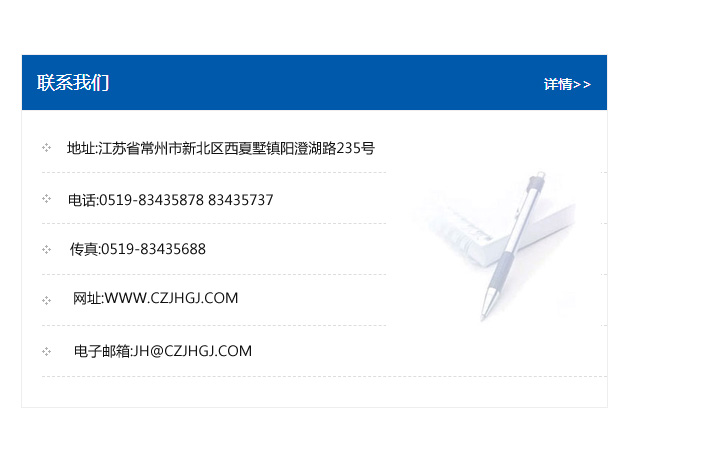 地址:常州市新北區友邦商務大廈1幢16、17層  電話:0519-85101652  傳真:0519-85112595  郵編:213022  網址:www_cz-jiayue_cn.bjxstkm.com  郵箱:xiajifengaa@163.com